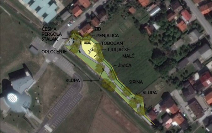Tlocrt prikazuje potrebne sadržaje te jednostavan prijedlog uređenja. Na sjeverozapadnoj strani nalazi se manja opločena površina s pergolom (nadstrešnicom) s pripadajućim klupama i stolovima. Uz pergolu se nalaze stalci za bicikle i česma. Južnije je smješteno nekoliko sprava za dječju igru, a od susjednih kuća ih odvaja zid različitih visina. Staza i igralište mogu predstavljati prvu fazu u uređenju potoka i pripadajućih sadržaja.