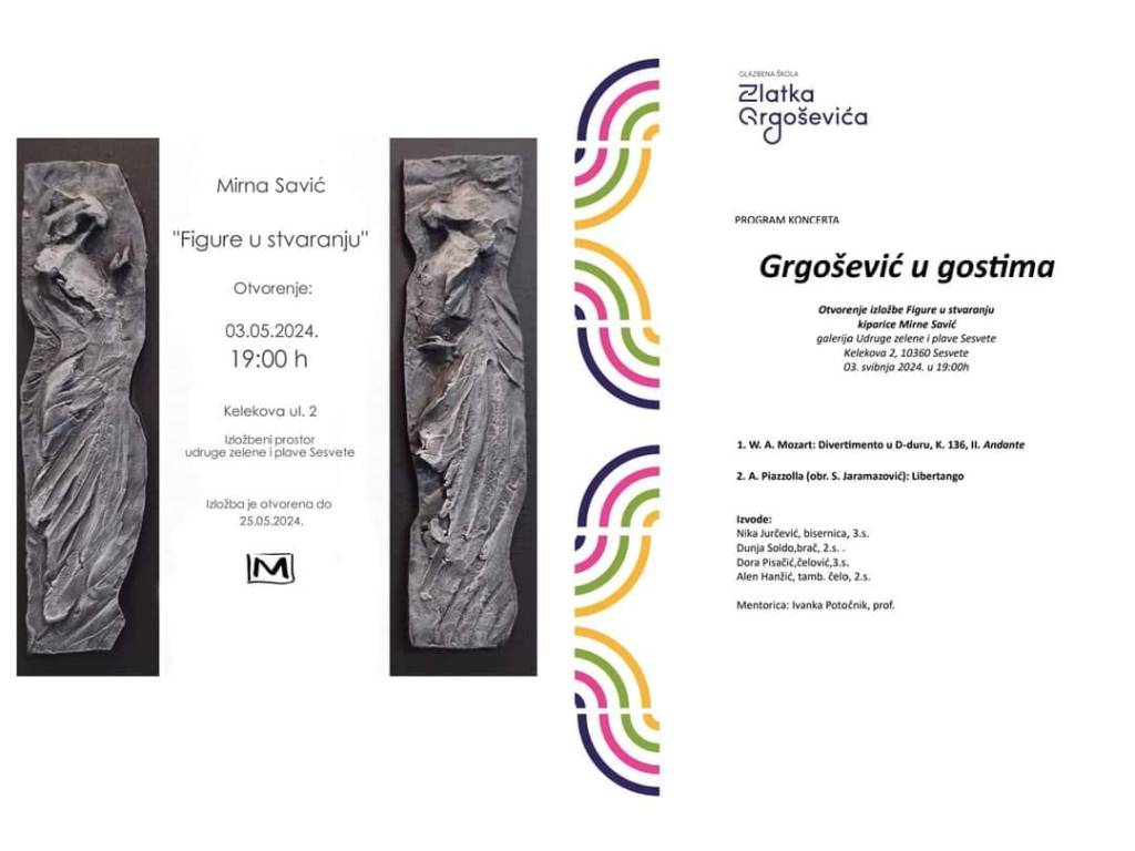 U Udruzi Zelene i plave Sesvete, 3. svibnja 2024. godine, svečano je otvorena izložba “Figure u stvaranju” mlade kiparice Mirne Savić. Posjetitelji galerijskog prostora u Kelekovoj 2 imaju priliku razgledati desetak skulptura i reljefnih figura izrađenih u različitim materijalima – od kamena oniksa, preko maslinovog drva, do metalnih skulptura. Uz trodimenzionalne radove, izložba sadrži i crteže i slike koji služe kao predlošci za skulpture ili ih možemo promatrati kao samostalna umjetnička djela, kako je naglasila kustosica izložbe, Sanda Stanaćev Bajzek.