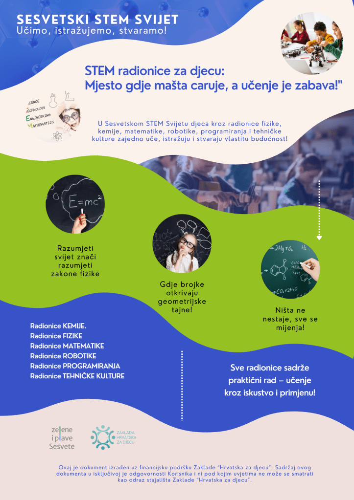 Udruga Zelene i plave Sesvete pokrenula je novi projekt pod nazivom “Sesvetski STEM svijet: Učimo, istražujemo, stvaramo!”. Projekt je osmišljen kako bi potaknuo djecu i mlade na području Sesveta na istraživanje, učenje i stvaranje unutar STEM područja kroz niz praktičnih radionica i događanja.