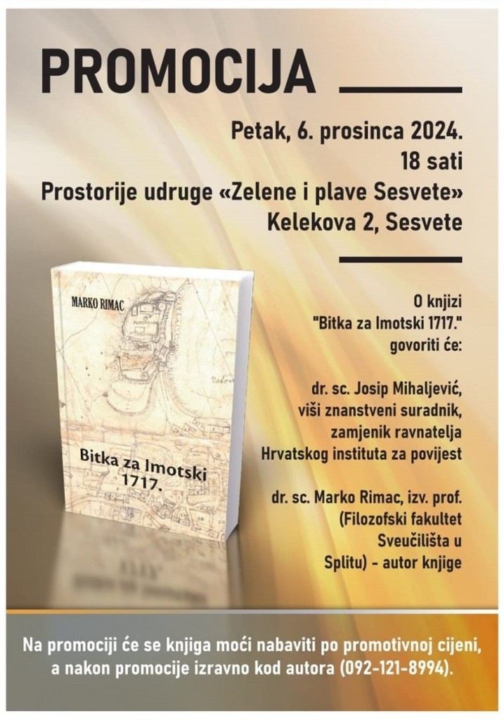 U petak, 6. prosinca 2024., s početkom u 18 sati, u prostorijama Udruge Zelene i plave Sesvete (Kelekova 2, Sesvete) održat će se promocija knjige “Bitka za Imotski 1717.” autora dr. sc. Marka Rimca, izvanrednog profesora na Filozofskom fakultetu Sveučilišta u Splitu.