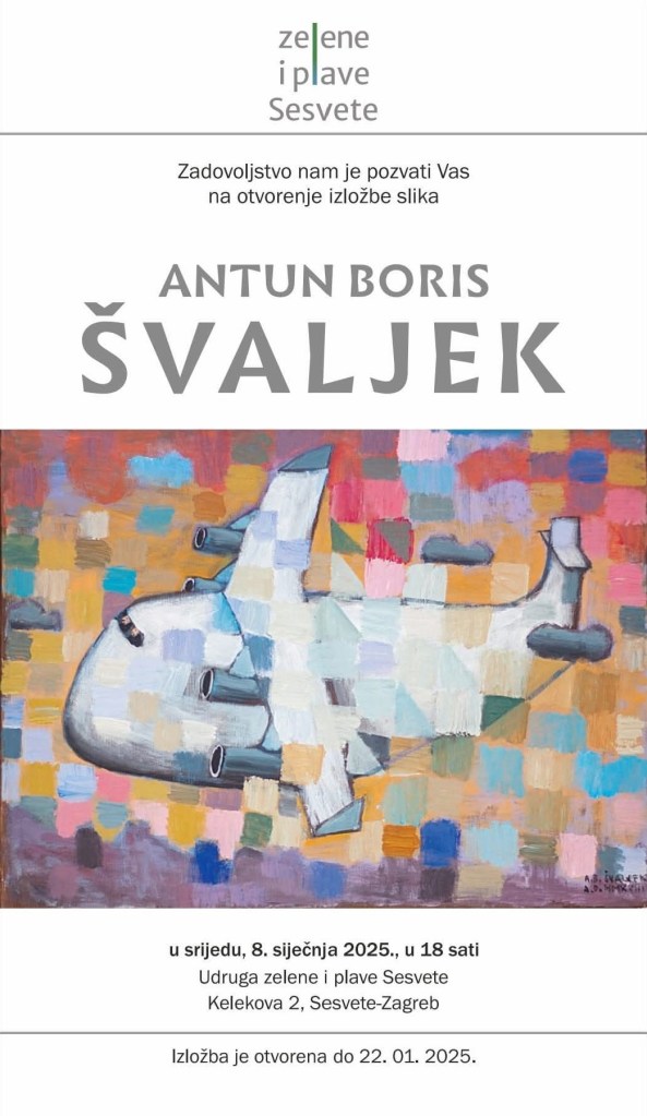 S velikim zadovoljstvom pozivamo Vas na svečano otvorenje izložbe slika Antuna Borisa Švaljeka, koje će se održati u srijedu, 8. siječnja 2025. u 18 sati, u prostorijama Udruge Zelene i plave Sesvete (Ivana Keleka 2, Sesvete).