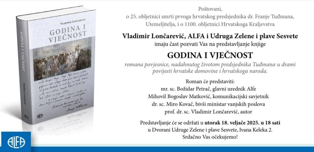 U povodu 25. obljetnice smrti prvog hrvatskog predsjednika dr. Franje Tuđmana, utemeljitelja moderne hrvatske države, te 1100. obljetnice Hrvatskog Kraljevstva, udruga Zelene i plave Sesvete, nakladnička kuća Alfa i autor Vladimir Lončar organiziraju predstavljanje romana „Godina i vječnost”.