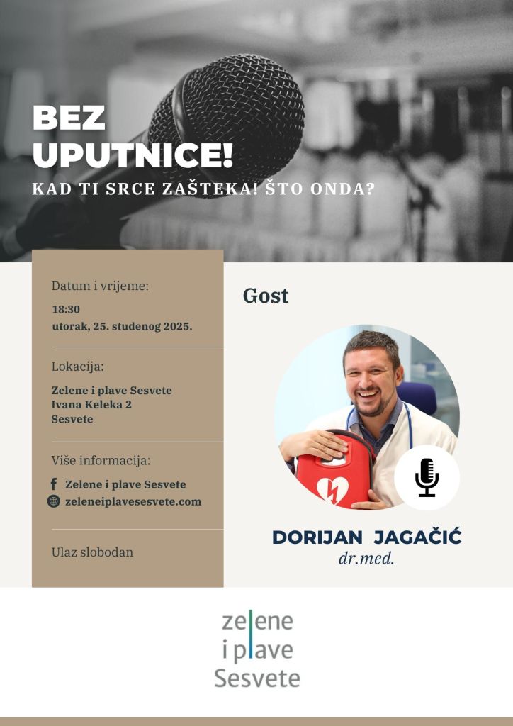 U organizaciji Udruge Zelene i plave Sesvete, u utorak 25. studenoga 2025. godine u 18.30 sati, na adresi Kelekova 2, Sesvete, održat će se nova tribina iz zdravstvenog ciklusa „Bez uputnice“. Ovoga puta tema je jedno od najvažnijih pitanja suvremenog života – kardiovaskularno zdravlje.