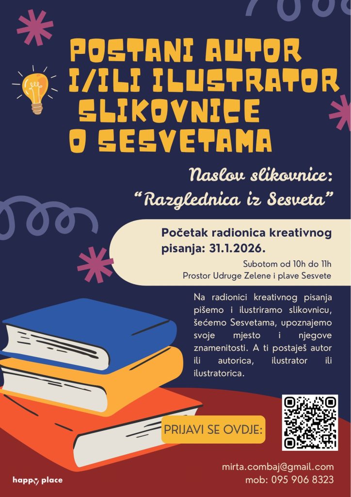 Radionice započinju 31. siječnja 2026. godine, a održavat će se subotom od 10 do 11 sati u prostorijama Udruge Zelene i plave Sesvete (Kelekova 2). Kroz vođeni kreativni proces polaznici će pisati tekstove i izrađivati ilustracije, upoznavati Sesvete, njihove znamenitosti, priče i identitet te ih pretočiti u zajedničku slikovnicu.