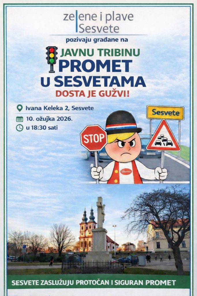 Udruga Zelene i plave Sesvete organizira javnu tribinu pod nazivom „Promet u Sesvetama: Dosta je gužvi!“, koja će se održati u utorak, 10. ožujka 2026. godine u 18.30 sati u prostorijama udruge u Kelekovoj 2.