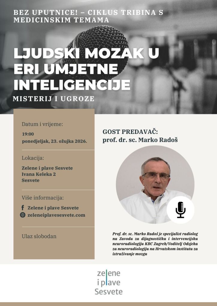 U sklopu ciklusa zdravstveno-edukativnih tribina „Bez uputnice!“, Udruga Zelene i plave Sesvete organizira novo zanimljivo predavanje pod nazivom „Ljudski mozak u eri umjetne inteligencije“, koje će se održati u ponedjeljak, 23. ožujka 2026. godine u 19 sati, u prostoru udruge u Ulici Ivana Keleka 2.