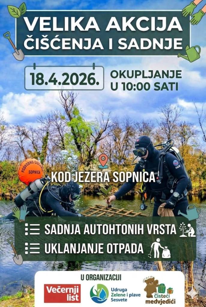 U sklopu Večernjakovog projekta „Rezolucija Zemlja“ u subotu, 18. travnja 2026. godine održat će se velika proljetna ekološka akcija čišćenja i sadnje pod nazivom „NO time to WASTE“, s ciljem uređenja okoliša jezera Sopnica.