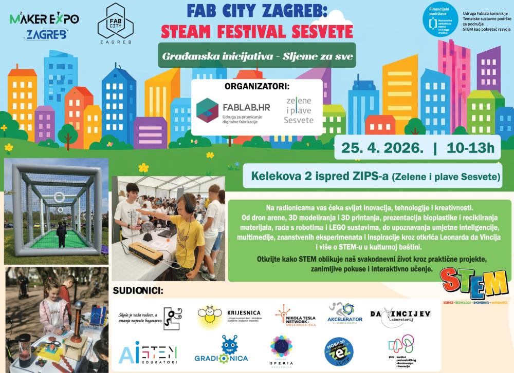 U subotu, 25. travnja 2026. godine, Sesvete će postati središte znanosti, tehnologije i kreativnosti. Ispred Udruge Zelene i plave Sesvete (Kelekova 2), od 10 do 13 sati održat će se Fab City Zagreb: STEAM festival, besplatno događanje namijenjeno svim generacijama.