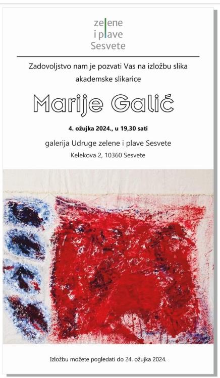 Udruga Zelene i plave Sesvete s radošću najavljuje izložbu slika akademske slikarice Marije Galić, koja će biti otvorena u ponedjeljak, 4. ožujka 2024., u 19:30 sati u galerijskom prostoru Udruge u Kelekovoj 2. Izložba predstavlja priliku za sve ljubitelje likovne umjetnosti i kulture da se upoznaju s najnovijim radovima ove istaknute umjetnice, koja živi i djeluje upravo u Sesvetama.