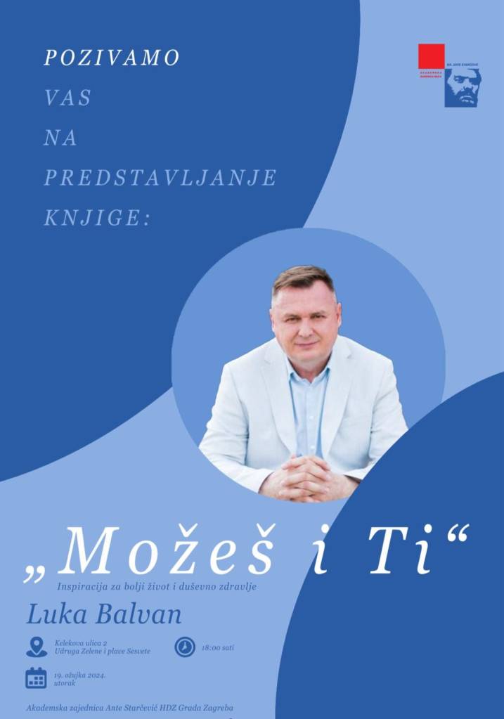 U dvorani udruge Zelene i plave Sesvete u Kelekovoj ulici 2, 19. ožujka 2024., održana je promocija knjige “Možeš i Ti” dr. Luke Balvana, u organizaciji udruge Zelene i plave Sesvete i Akademske zajednice Ante Starčević. Ovo je posebno događanje okupilo brojne posjetitelje željne inspiracije i novih uvida u mentalno zdravlje i duhovni razvoj. Promociju su svojim uvodnim riječima obogatili promotori dr. Ante Barišić i dr. Miro Jakovljević, koji su uz autora iznijeli vlastite dojmove o knjizi, naglašavajući njenu važnost kao vodiča za osobni rast i bolje duševno zdravlje.
