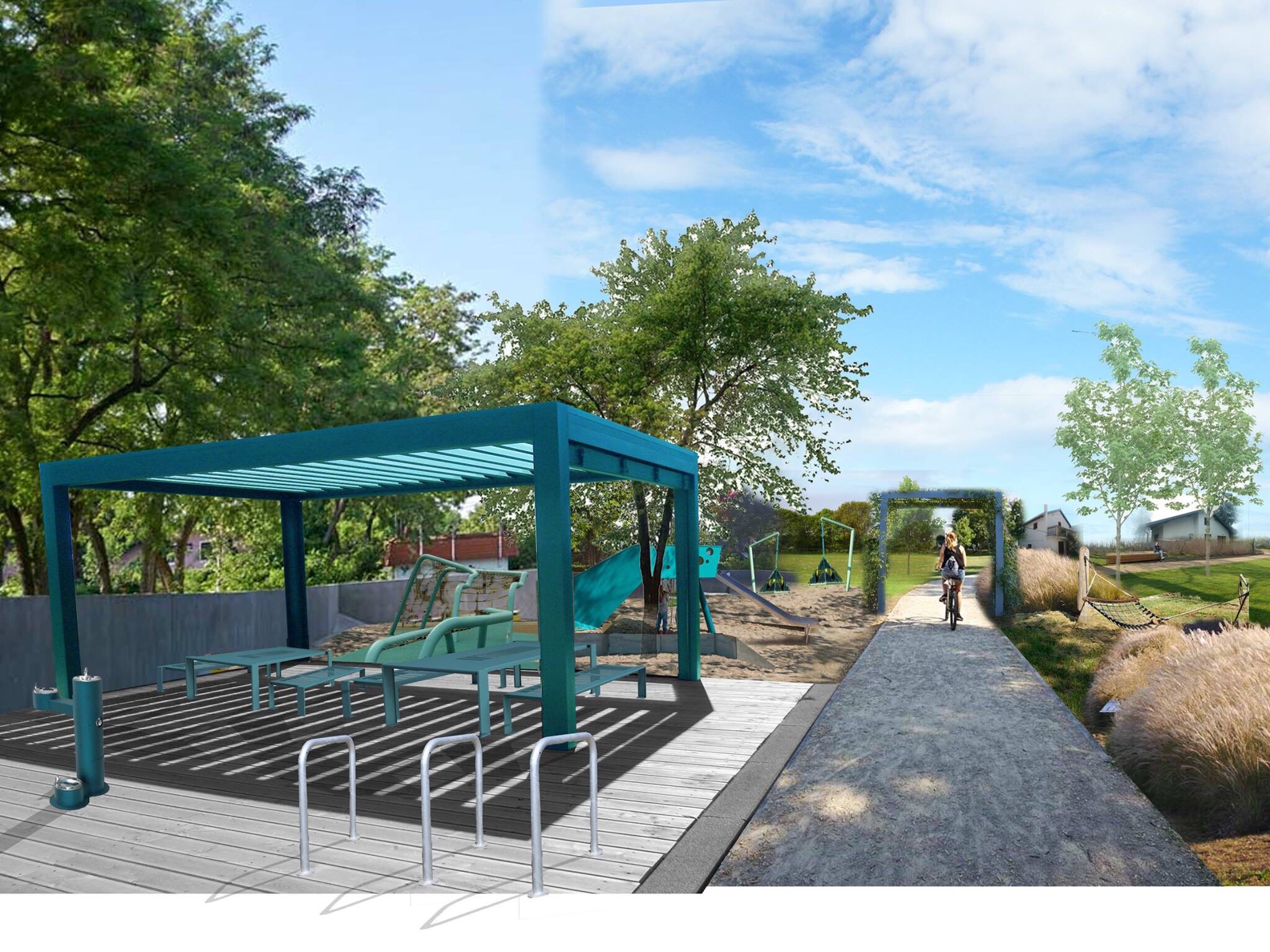 Tlocrt prikazuje potrebne sadržaje te jednostavan prijedlog uređenja. Na sjeverozapadnoj strani nalazi se manja opločena površina s pergolom (nadstrešnicom) s pripadajućim klupama i stolovima. Uz pergolu se nalaze stalci za bicikle i česma. Južnije je smješteno nekoliko sprava za dječju igru, a od susjednih kuća ih odvaja zid različitih visina. Staza i igralište mogu predstavljati prvu fazu u uređenju potoka i pripadajućih sadržaja.