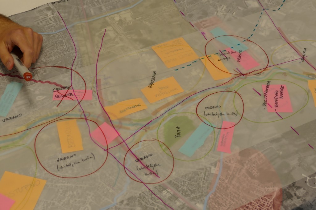 Ideja je stvorena u suradnji sa zajednicom; provedeno je par senzornih šetnji u kojima su sudionici slobodno iznosili svoje dojmove, uspomene i želje vezane za prostor. Inspiraciju i smjernice za vođenje ove vrste aktivnosti pronašli smo na temelju provedenih predavanja i danih literatura tijekom seminara, posebno knjige “Design as democracy”. Naslov jednog od poglavlja – “Going to the peoples coming” zaokupio nas je do kraja seminara i podsjetio na važnost stvaranja prvog koraka prilikom stupanja u kontakt sa zajednicom. Naše obraćanje zajednici, umjesto traženja da ona priđe nama. Iz takvog pristupa pružana nam je potrebna količina povratnih informacija. Nekoliko stanovnika obližnjih prostora poveli smo u šetnju po nasipu i pružali im priliku da razgovaraju o životu koji tamo vode. Postavili smo im nekoliko pitanja o kvaliteti života i neposredne okoline. Trudili smo se formirati pitanja vrlo široko i prepustiti sudionicima vođenje nadolazećeg razgovora, otvoreni smo bili za sve tipove odgovora i poticali opuštenost kako bismo postigli što prirodniji način razgovora.