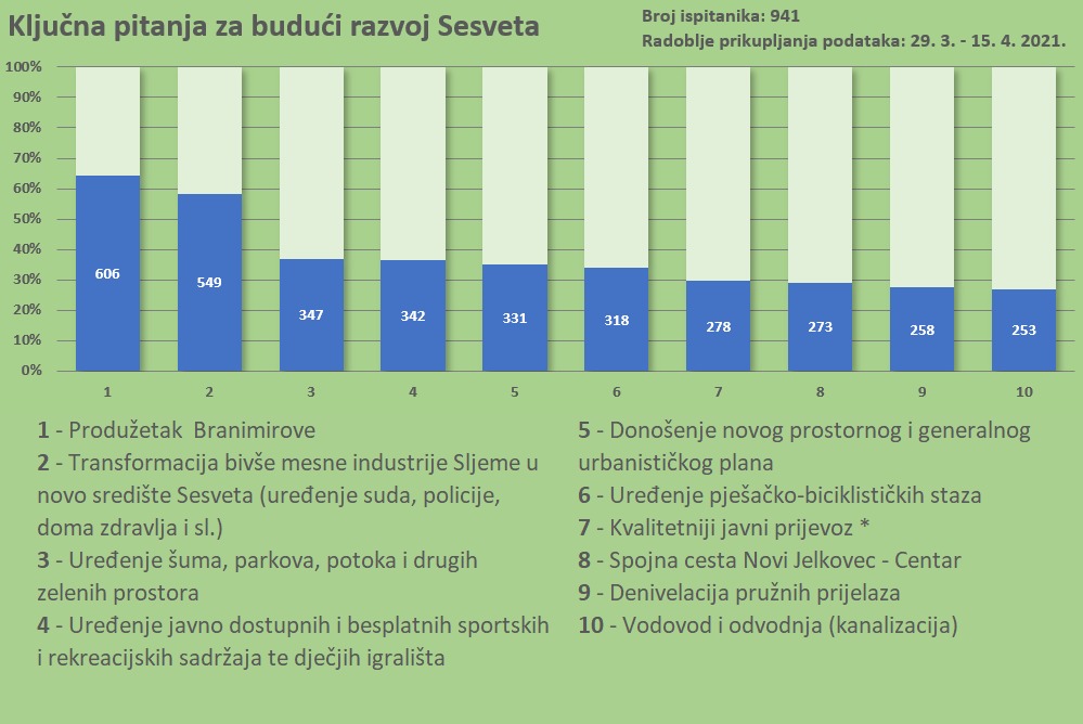 Udruga Zelene i plave Sesvete je 29. ožujka 2021. godine na svojim stranicama postavila kratki anketni upitnik gdje su svi građani gradske četvrti Sesvete pozvani da odaberu ključna pitanja za koja smatraju prioritetnima u kontekstu budućeg razvoja Sesveta. Pritom je bilo ponuđeno dvadeset mogućih odgovora, za koje su članovi udruge smatrali relevantnima, a ispitanicima je bilo omogućeno dodati vlastite odgovore. Anketni upitnik je trajao do 15. travnja 2021. godine, a do zatvaranja mogućnosti odgovaranja na upitnik sudjelovao je 941 ispitanik. Ovu brojku smatramo relevantnom za okvirni pregled želja stanovnika Sesveta s obzirom na to da govorimo o gotovo 1% sveukupnog stanovništva Sesveta. Upitnik nije ispitivao demografsku sliku sudionika, već je želja bila steći generalnu sliku o potrebama Sesvećana s obzirom na približavanje datuma predstojećih izbora.